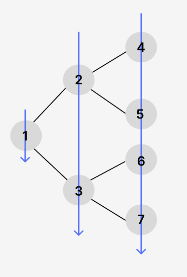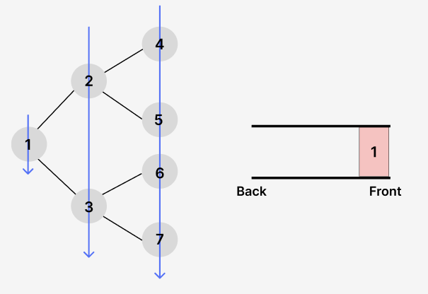 1번 노드에서 출발해서, 1번의 자식인 2번과 3번을 동시에 넣고, 2 → 3 순서대로 꺼내서 탐색하며, 그들의 자식인 4, 5, 6, 7을 넣는다.