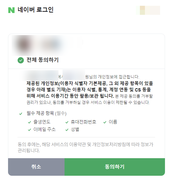 난 이미 네이버엔 로그인되어있던 상황이라서 바로 이렇게 떴다. 동의를 눌러 로그인을 하면 callbak url로 적었던 웹페이지로 이동하게 된다.
