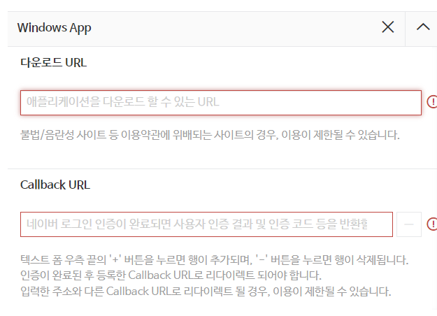 나도 같은 상황이었는데 그냥 다운로드 URL은 스팀 URL로 해두었고 Callback URL은 네이버에서 제공해주는 Windows App SDK 튜토리얼 문서에 callback 예시로